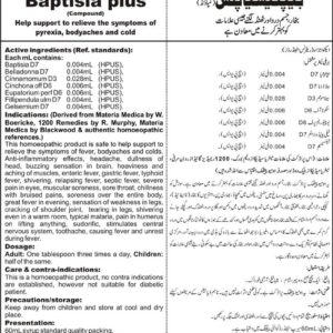 Help support to relieve the symptoms of pyrexia, body aches and cold Active ingredients (Ref. standard): Baptisia D5 0.24mL (HPUS), Belladonna D7 0.24mL (HPUS), Cinnamomum D1 1.68mL (HPUS), Cinchona off D1 0.36mL (HPUS), Eupatorium perf D1 0.36mL (HPUS), Fillipendula ulm D3 0.24mL (HPUS), Gelsemium D4 0.24mL (HPUS).