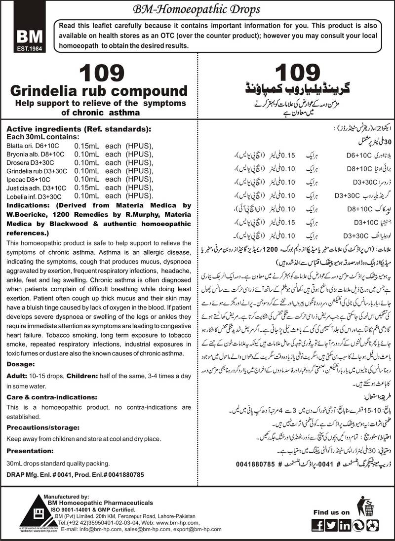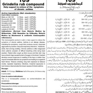 Composition: Grindelia RubD3+30C, IpecacD1+10C, Blatta OriD1+10C, Lobellia InfD3+30C, DroseraD3+30C, Bryonia AlbD1+10C, Justisia AdhD1+10C Specific Indication: Chronic lungs disorder has three specific indications i.e. coughing, breathlessness and wheezing. Asthma is an allergic disease, indicating the following specific symptoms, cough that produces mucus, dyspnoea aggravated by exertion, frequent respiratory infections, headache, ankle, feet and leg swelling. General…