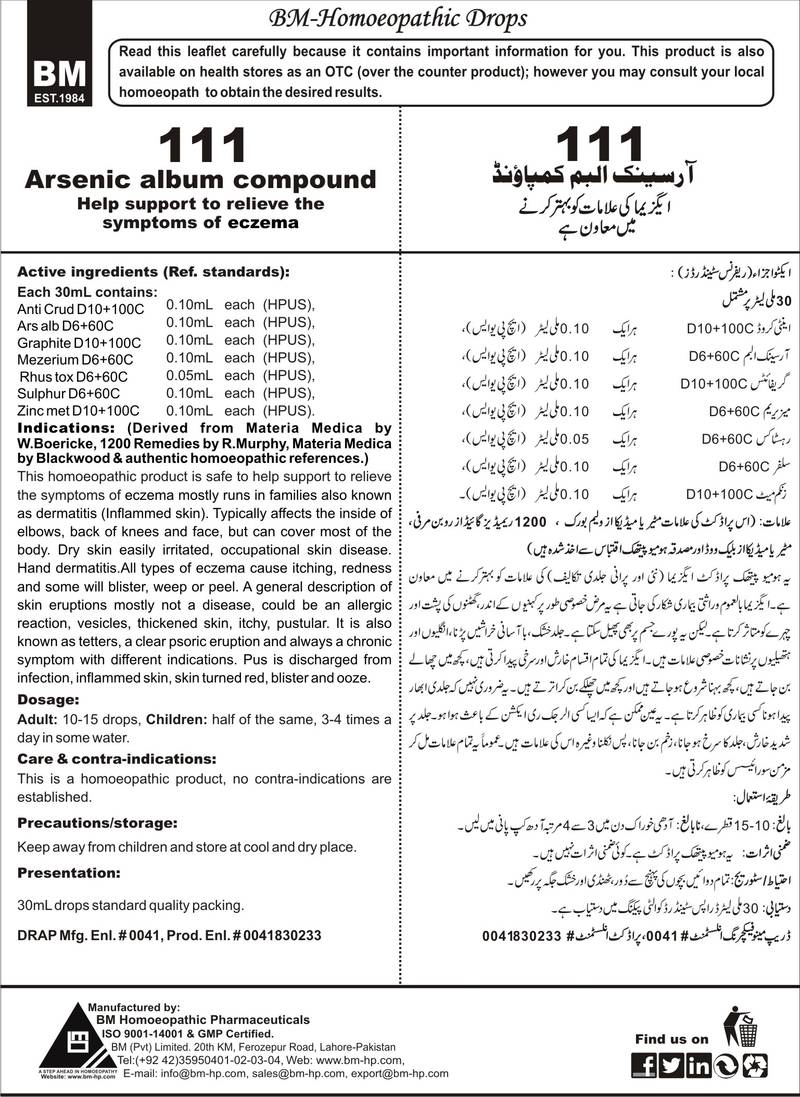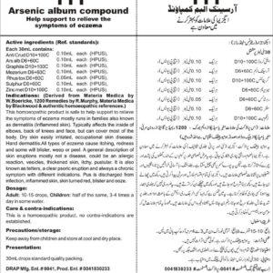 Composition: Ars AlbD6+60C, MezeriumD6+60C,Rhus ToxD6+60C, SulphurD6+60C, Zinc MetD10+100C, Anti CrudD10+100C, GraphitesD10+100C Specific Indication: Eczema mostly runs in families also known as dermatitis (Inflamed skin). Typically affects the inside of elbows, back of knees and face, but can cover most of the body. Dry skin easily irritated, occupational skin disease. Hand dermatitis. General Indication: All types of eczema cause itching, redness and some will blister, weep or peel. A general description of skin eruptions mostly not a disease, could be an allergic reaction, vesicles, thickened skin, itchy, pustular. It is also known as tetters, a clear psoric eruption and always a chronic symptom with different indications. Pus is discharged from infection, inflamed skin, skin turned red, blister and ooze. This disorder of eczema runs in families typically affects the inside of the elbows, back of the knees and the face, but can cover most of the body.