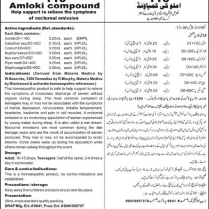 Composition: AmlokiD1+10C, Caladium SegD2+20C, ConiumD6+60C, Nuphar LuteumD3+30C, Piper MethD4+40C, StaphysagriaD6+60C, Nux VomD2+20C Specific Indication: Involuntary discharge of semen without orgasm. Ejaculation of semen during sleep. The most common complaint of teenagers may or may not be associated with the symptoms of mental depression, nervousness, irritable temperament, headache, backache and pain in calf muscles. General Indication:…