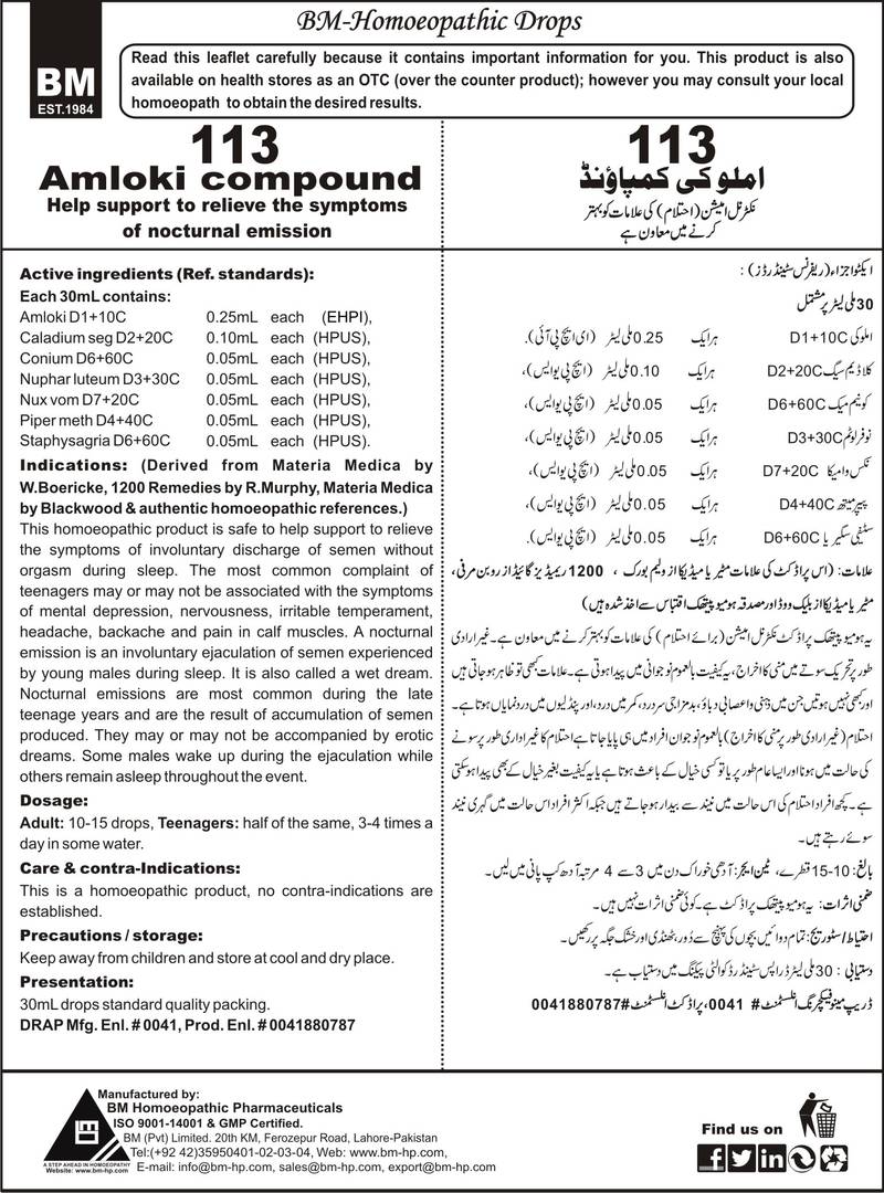Composition: AmlokiD1+10C, Caladium SegD2+20C, ConiumD6+60C, Nuphar LuteumD3+30C, Piper MethD4+40C, StaphysagriaD6+60C, Nux VomD2+20C Specific Indication: Involuntary discharge of semen without orgasm. Ejaculation of semen during sleep. The most common complaint of teenagers may or may not be associated with the symptoms of mental depression, nervousness, irritable temperament, headache, backache and pain in calf muscles. General Indication: A nocturnal emission is an involuntary ejaculation of semen experienced by young males during sleep. It is also called a wet dream. Nocturnal emissions are most common during the late teenage years and are the result of accumulation semen production. They may or may not be accompanied by erotic dreams. Some males wake up during the ejaculation while others remained sleep throughout the event. Nocturnal emission is highly variable. Some males have experienced large number of nocturnal emissions as teenagers, whereas some never experience once in their lives. BM nocturnal emission compositum helps to control the causeless nocturnal emission and one can get rid of this problem by the use of this compositum.