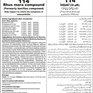 Composition: BacillusD100+100C, CorticotrophinD100+100C, D.N.A.D100+100C, Morgan PureD100+100C, BryoniaD100+100C, Rhus ToxD100+100C, Nux VomD100+100C Specific Indication: Osteoarthritis is the most common type of arthritis. Early morning stiffness, stiffness following periods of rest. Pain that worsens on joint use and loss of joint function. Local tenderness, soft tissue swelling, swelling and redness in joints. Reduced joint movement, symptoms vary…