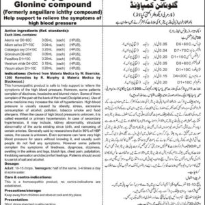Composition: Anguillare IchthyD30+100C, Crataegus Oxy +10C, Passiflora +10C, Hypophysis PosteriumD30+100C, Glonine +10C,Morgan PureD200+200C, Spartium ScopD3+30C Viscum AlbumD200+200C Specific Indication: Symptoms of the high blood pressure are almost non-existent, however, some patients complain of dizziness, headache & blurred vision. Some of them complain of the pain at the back of the head (Occipital area). Use of some medicine…