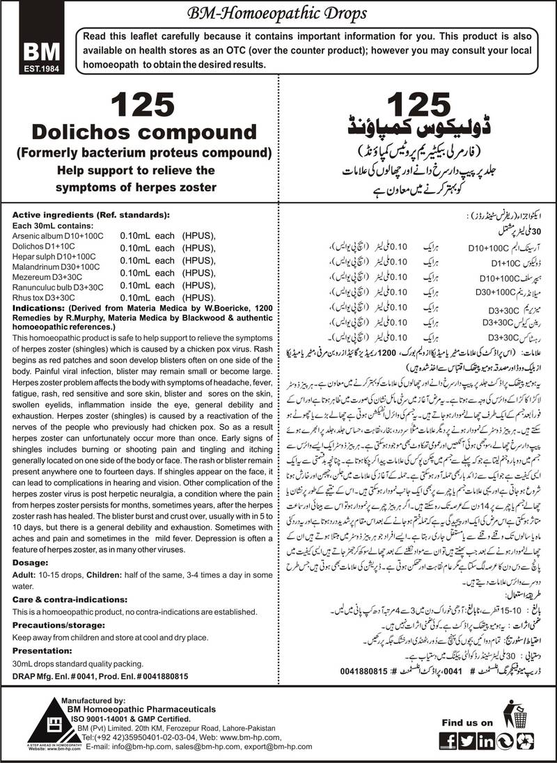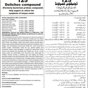 Help support to relieve the symptoms of herpes zoster Active ingredients (Ref. standard): Arsenic album D10+100C 0.10mL each (HPUS), Dolichos D1+10C 0.10mL each (HPUS), Hepar sulph D10+100C 0.10mL each (HPUS), Malandrinum D30+100C 0.10mL each (HPUS), Mezereum D3+30C 0.10mL each (HPUS), Ranunculuc bulb D3+30C 0.10mL each (HPUS), Rhus tox D3+30C 0.10mL each (HPUS).