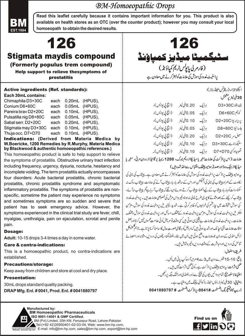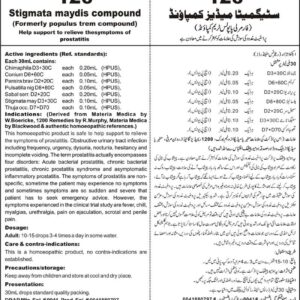Help support to relieve the symptoms of prostatitis Active ingredients (Ref. standard): Chimaphila D3+30C 0.20mL each (HPUS), Conium D6+60C 0.05mL each (HPUS), Pareira brav D2+20C 0.10mL each (HPUS), Pulsatilla nig D8+80C 0.05mL each (HPUS), Sabal serr. D2+20C 0.20mL each (HPUS), Stigmata may D3+30C 0.10mL each (HPUS), Thuja occ. D7+D70 0.10mL each (HPUS).