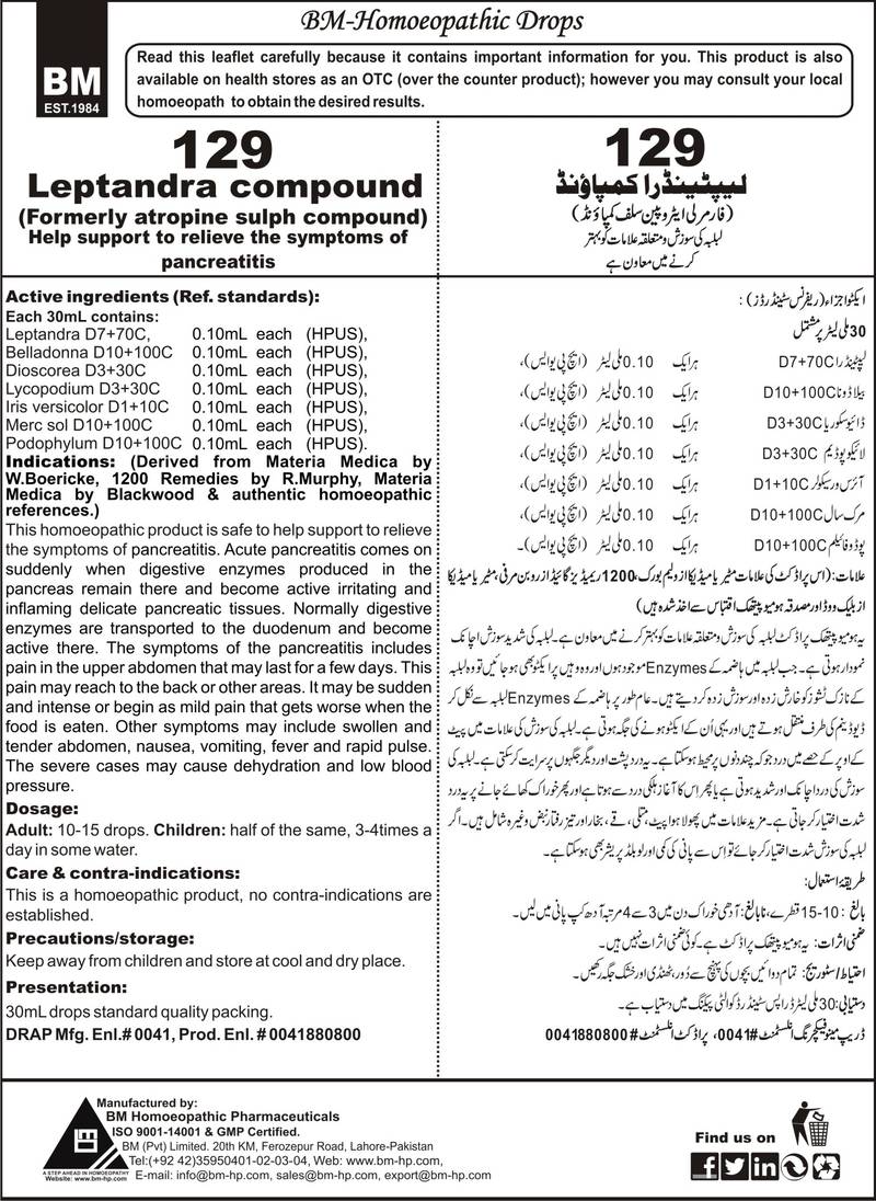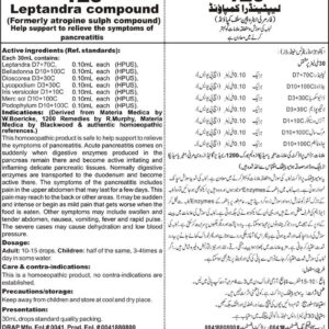 Help support to relieve the symptoms of pancreatitis Active ingredients (Ref. standard): Leptandra D7+70C 0.10mL each (HPUS), Belladonna D10+100C 0.10mL each (HPUS), Dioscorea D3+30C 0.10mL each (HPUS), Lycopodium D3+30C 0.10mL each (HPUS), Iris versicolor D1+10C 0.10mL each (HPUS), Merc sol D10+100C 0.10mL each (HPUS), Podophylum D10+100C 0.10mL each (HPUS).