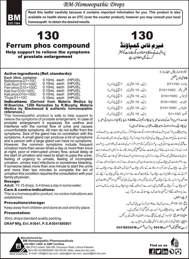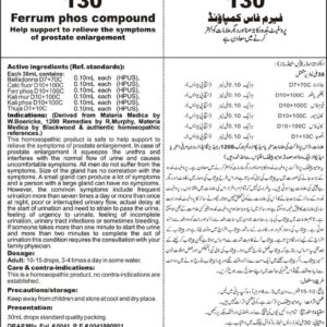 Help support to relieve the symptoms of prostate enlargement Active ingredients (Ref. standard): Belladonna D7+70C 0.10mL each (HPUS), Calc fluor D10+100C 0.10mL each (HPUS), Ferr phos D10+100C 0.10mL each (HPUS), Kali mur D10+100C 0.10mL each (HPUS), Kali phos D10+100C 0.10mL each (HPUS), Thuja D1+10C 0.10mL each (HPUS).