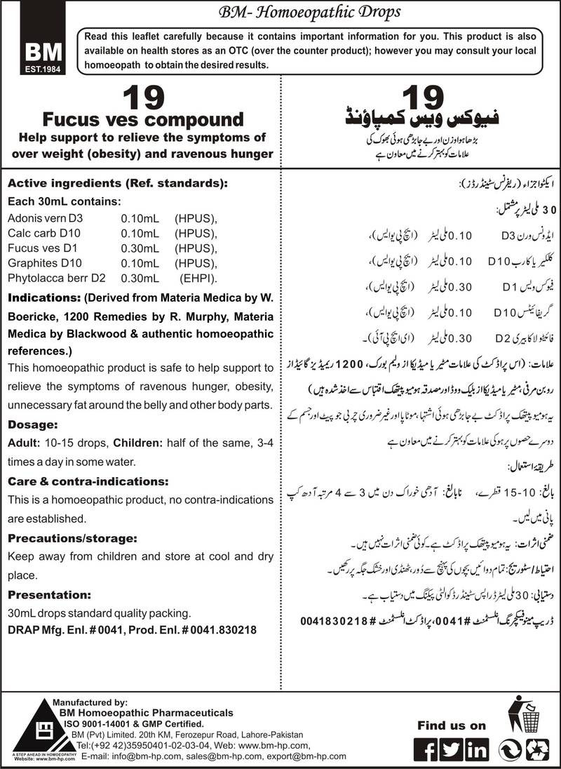 DRAP Product.Enl No. 0041.830218 Composition: Adonis VernD3, Calc CarbD10, Fucus VesD1, GraphitesD10, Phytolacca BerD2 General Indication: May help in the symptoms of ravenous hunger, obesity, unnecessary fat around the belly and other body parts.