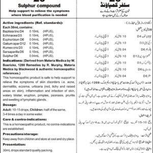 DRAP Product.Enl No. 0041830219 Composition: Baptisia TincD4, EchinaceaD3, EuphorbiumD6, Galium AparD12, Rumex C.D3, SarsaprillaD6,SulphurD6 General Indication: May help in the symptoms of Skin diseases i.e. acne, dermatitis, eczema, urticaria (red, itchy and raised areas on skin), inflammation and infection of skin, watery blister, eruption, pimples, psoriasis, pruritis and swelling of lymphatic gland.