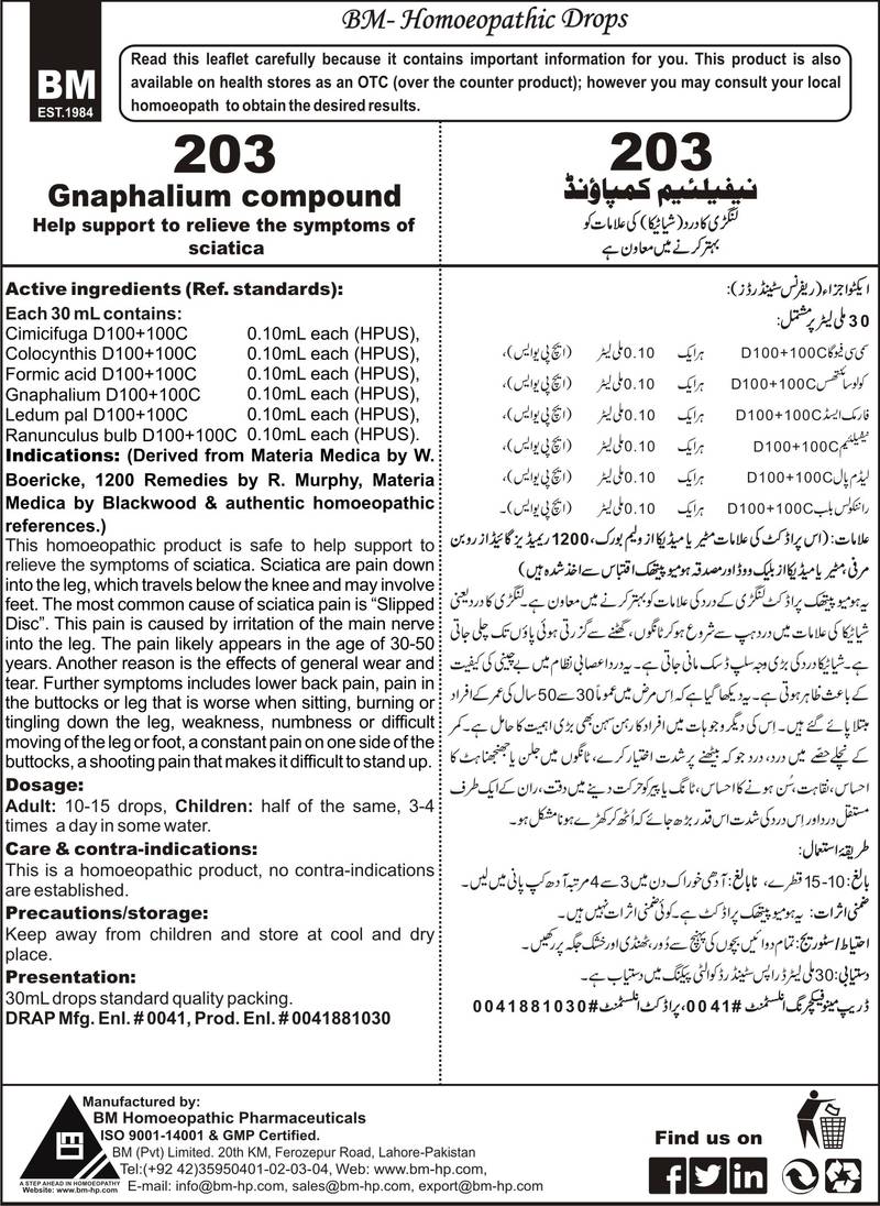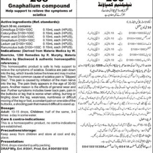 Help support to relieve the symptoms of sciatica Active ingredients (Ref. standard): Cimicifuga D100+100C 0.10mL each (HPUS), Colocynthis D100+100C 0.10mL each (HPUS), Formic acid D100+100C 0.10mL each (HPUS), Gnaphalium D100+100C 0.10mL each (HPUS), Ledum pal D100+100C 0.10mL each (HPUS) Ranunculus bulb D100+100C 0.10mL each (HPUS).