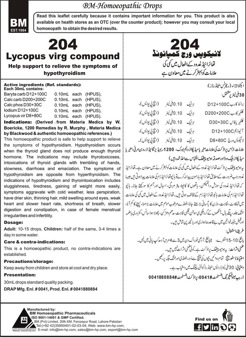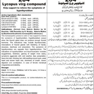 Help support to relieve the symptoms of hypothyroidism Active ingredients (Ref. standard): Baryta carb D12+100C 0.10mL each (HPUS), Calc carb D200+200C 0.10mL each (HPUS), Calc phos D30+30C 0.10mL each (HPUS), Iodium D12+100C 0.10mL each (HPUS), Lycopus vir D8+80C 0.10mL each (HPUS).