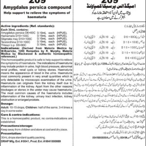 Help support to relieve the symptoms of haematuria Active ingredients (Ref. standard): Amygdalus persica D6+60C 0.10mL each (HPUS), Hamamalis D10+100C 0.10mL each (HPUS), Stigmata may D10+100C 0.10mL each (HPUS), Terebinthina D10+100C 0.10mL each (HPUS), Thlaspi b.p. D6+60C 0.10mL each (HPUS).