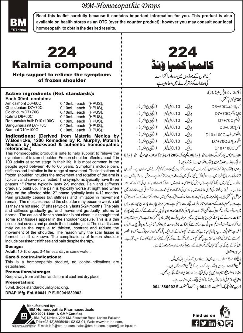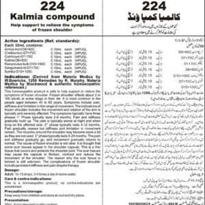 Help support to relieve the symptoms of frozen shoulder Active ingredients (Ref. standard): Arnica mont D6+60C 0.10mL each (HPUS), Chelidonium D7+70C 0.10mL each (HPUS), Colchicum D7+70C 0.10mL each (HPUS), Kalmia D6+60C 0.10mL each (HPUS), Ranunculus bulb D10+100C 0.10mL each (HPUS), Sanguinaria nit D7+70C 0.10mL each (HPUS), Sumbul D10+100C 0.10mL each (HPUS).
