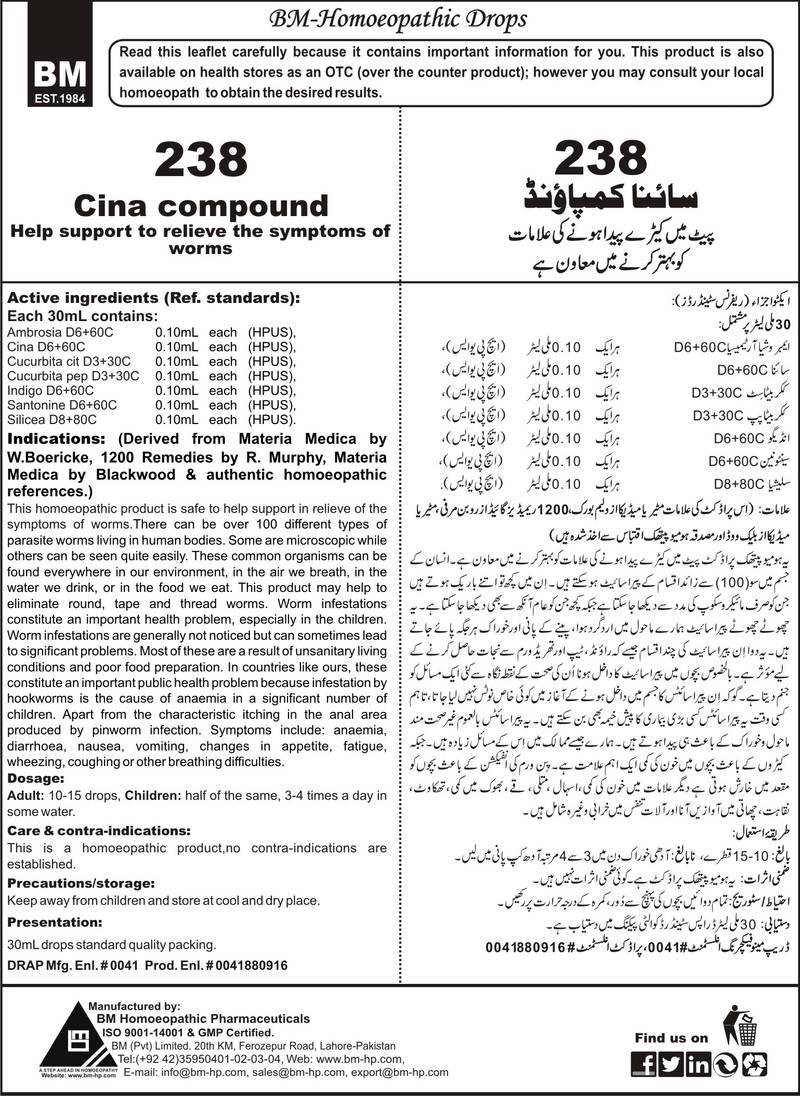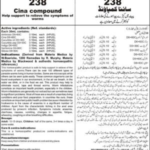 Help support to relieve the symptoms of worms Active ingredients (Ref. standard): Ambrosia D6+60C 0.10mL each (HPUS), Cina D6+60C 0.10mL each (HPUS), Cucurbita cit D3+30C 0.10mL each (HPUS), Cucurbita pep D3+30C 0.10mL each (HPUS), Indigo D6+60C 0.10mL each (HPUS), Santonine D6+60C 0.10mL each (HPUS), Silicea D8+80C 0.10mL each (HPUS).