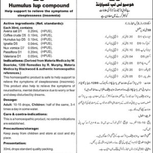 DRAP Product.Enl No. 00411000333 Composition: Avena SatD1, Coffea CrudaD5, Humulus LupD5, IgnatiaD5, Nux VomicaD4, PassifloraD1, ValerianaD1. General Indication: May help in the symptoms of Neuresthenia (insomnia) Sleeplessness, mental disturbance due to worry or fear & sleep disturbed by dreams.