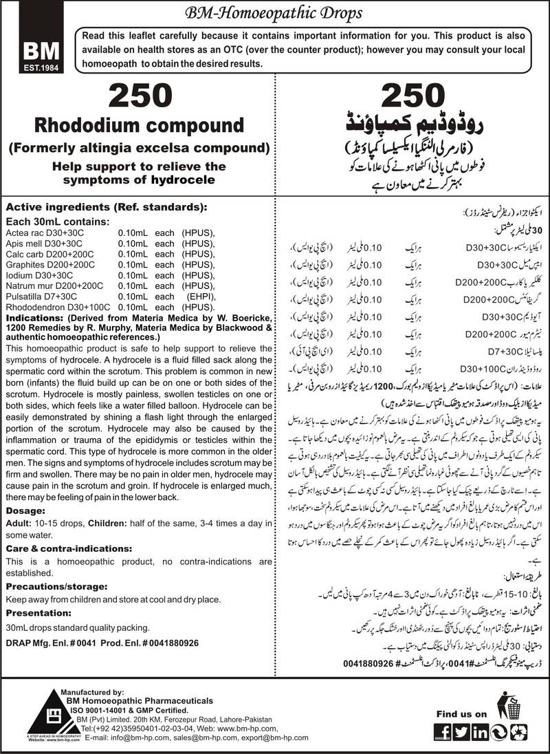 Help support to relieve the symptoms of hydrocele Active ingredients (Ref. standard): Actea rac D30+30C 0.10mL each (HPUS), Iodium D30+30C 0.10mL each (HPUS), Apis mell D30+30C 0.10mL each (HPUS), Calc carb D200+200C 0.10mL each (HPUS), Graphites D200+200C 0.10mL each (HPUS), Natrum mur D200+200C 0.10mL each (HPUS), Pulsatilla D7+30C 0.10mL each (EHPI), Rhododendron D30+100C 0.10mL each (HPUS).