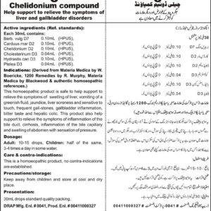 DRAP Product.Enl No. 00411000327 Composition: Berb. VulgD3, Carduus MD2, ChelidoniumD2, CholestrinumD3, HydrastisD3, PteleaD3. General Indication: May help in the symptoms of Hepatitis, jaundice, flatulence, bitter taste, constipation, swelling of liver and abdomen with sensation of pressure, hepatic colic, inflammation of bile duct, bile capillary and gall bladder, also indicated in cholelithiasis & cholecystitis.