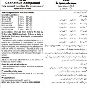 DRAP Product.Enl No. 0041880820 Composition: CeanothusD2, China offD3, GrindeliaD3, HelleborusD7, Hura BraD14, LycopodiumD14, Mentha PipD3. General Indication: May help in the symptoms of Spleen enlargement, infection mononucleosis, blood disorders, thalassaemia, sickle cell anaemia and tumours of spleen.