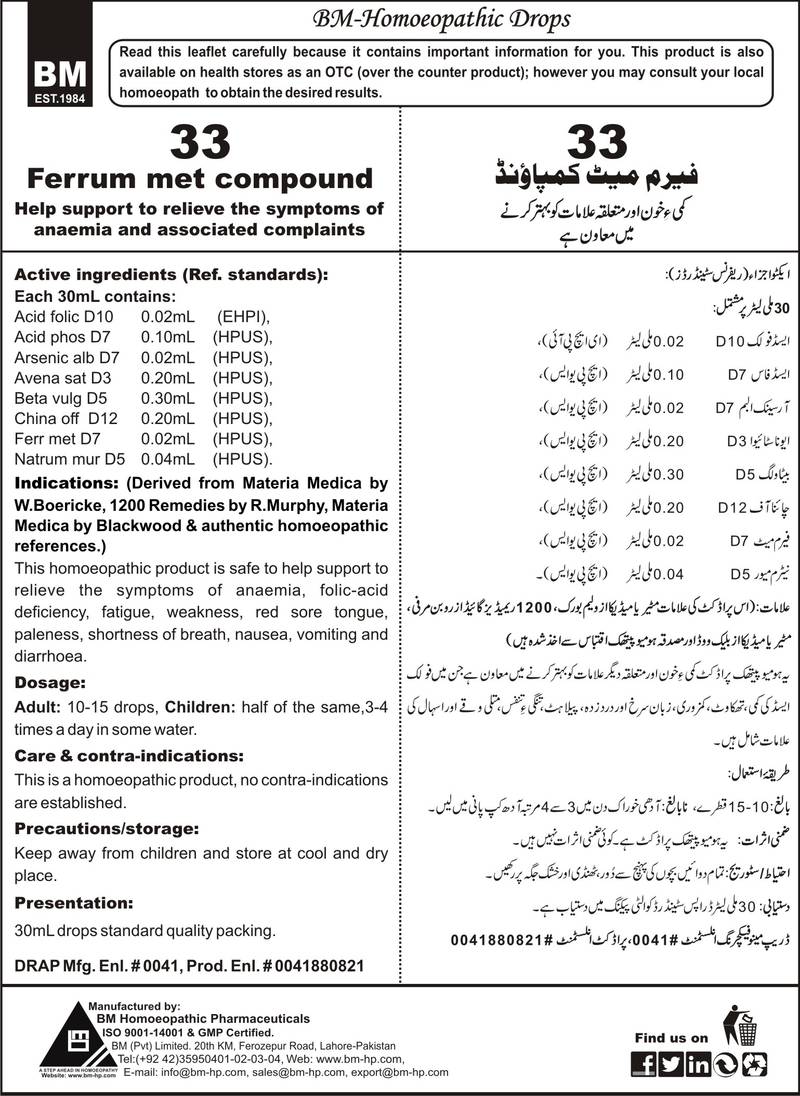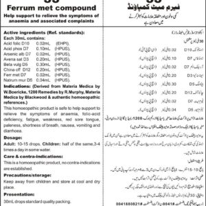 DRAP Product.Enl No. 0041880821 Composition: Acid FolicD10, Acid PhosD4, Arsenic AlbD4, Avena SatD3, Beta vulgD5, China OffD12, Ferr MetD5, Natrum MurD5 General Indication: May help in the symptoms of anaemia, folic-Acid deficiency, fatigue and weakness, red, sore tongue paleness shortness of breath, nausea, vomiting and diarrhoea.