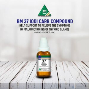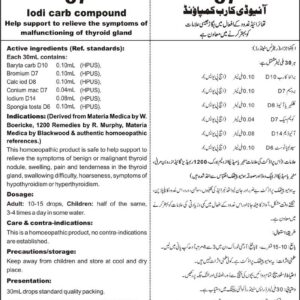DRAP Product.Enl No. 0041881024 Composition: Baryta CarbD10, BromiumD7, Calc lodD8, Conium MacD7, IodiumD14, Spongia TostD6, ThyroidinumD12 General Indication: May help in the symptoms of, benign or malignant thyroid nodule, swelling, pain & tenderness in the thyroid gland, swallowing difficulty, hoarseness, symptoms of hypothyroidism or hyperthyroidism.