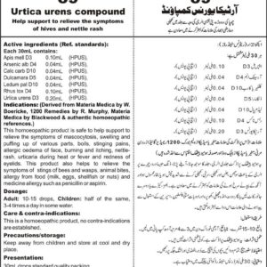 DRAP Product.Enl No. 0041830227 Composition: Apis MellD3, Ars AlbD4, Calc CarbD10, DulcamaraD5, Ledum PalD10, Rhus ToxD4, Urtica UrenD3 General Indication: May help in the symptoms of Mastocytosis, (numerous, itchy irregular, yellow or orange brown swelling on the skin). Worse after bathing or scratching. Allergy from food (milk, eggs, shellfish or nuts) medicine allergy, such as…