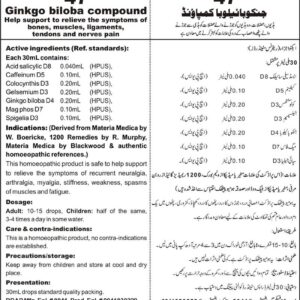 DRAP Product.Enl No. 0041830229 Composition: Acid SalicylicD8, CaffeinumD5, ColocynthisD3, GelsemiumD3, Ginkgo bilobaD4, Mag PhosD7, SpigeliaD3 General Indication: May help in the symptoms of recurrent neuralgia, arthralgia, myalgia fibromyositis, stiffness, weakness, spasms of muscles and fatigue.