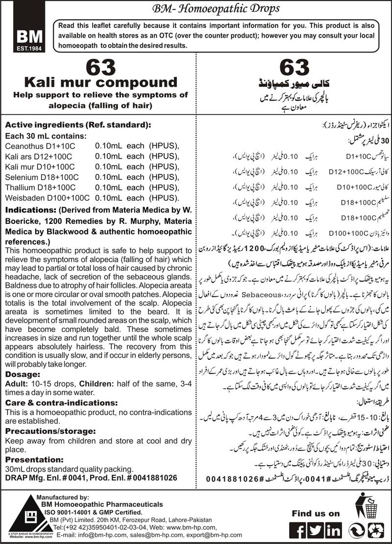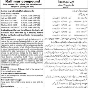 DRAP Product.Enl No. 0041881026 Composition: CeanothusD1+10C, Kali MurD10+100C, Kali ArsD12+100C, OophrinumD25+100C, SeleniumD18+100C, ThalliumD18+100C, WeisbadenD100+100C Specific Indication: Alopecia falling of hair, caused by chronic headache, lack of secretion of the sebaceous glands. Baldness due to atrophy of hair follicles. Alopecia of partial or more often total loss of hair. General Indication: Alopecia areata is one or more circular or oval smooth patches. Alopecia totalis is the total involvement of the scalp. Alopecia areata sometimes limited to the beard. Sometimes the nails are involved with pitting. It is development of small rounded areas on the scalp, which have become completely bald. These sometimes increases in size and run together until the whole scalp appears absolutely hairless. The recovery from this condition is usually slow, and if occuring in elderly persons, will probably take longer. BM Alopecia compositum is good therapy to accelerate the recovery. Alopecia areata occurs in males and females of all ages and races, however, onset most often begins in childhood and can be psychologically devastating. Although not life threatening, alopecia areata is most certainly lifealtering, and its sudden onset, recurrent episodes, and unpredictable course have a profound psychological impact on the lives of those disrupted by this disease. Alopecia usually refers to varying amounts of patchy hair loss to larger areas of little or no hair, this kind of hair loss generally takes place on the scalp but any hair bearing surface can be affected. Alopecia universal means loss of hair on the head and body, including eyelashes, eye brows, underarm hair, and pubic hair. It is pattern of the hair loss that covers the periphery of the scalp like a serpent forming a turban over the edges of the scalp.