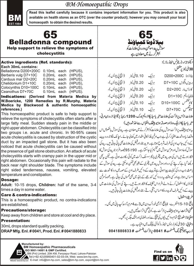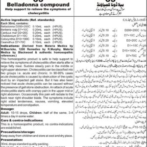 DRAP Product.Enl No. 0041880833 Composition: BelladonnaD200+200C, Berberis VulgD1+10C, Carduus MarD2+20C, ChelidoniumD1+10C, Fel TauriD200+200C, MandragoraD200+200C Specific Indication: Cholecystitis often starts after a large fatty meal. Sudden steady pain in the middle or right upper abdomen. Nausea, vomiting, fever & symptoms of constipation. General Indication: Cholecystitis can be classified into two groups i.e. acute and chronic. In 90-95% cases acute cholecystitis is caused by obstruction of the cystic duct by an impacted gall stone. But it has also been noticed that acute cholecystitis can be caused without the presence of gall stone obstruction. An attack of acute cholecystitis starts with crampy pain in the upper mid or right abdomen. Occasionally this pain will radiate to the back near right shoulder blade. The pain typically begins after having the meal but may be more pronounced when the heavy fatty meal is taken and it is not digested properly. The symptoms include right sided tenderness, nausea, vomiting, elevated temperature and constipation. If the cholecystitis is not properly treated the complications include perforation and gangrene of the gall bladder and emphysema, jaundice and hepatomegaly.