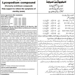 DRAP Product.Enl No. 00411000343 Composition: OrchitinumD20+100C, Testis BovisD20+100C, HeloniasD1+10C, Agnus CastD1+10C, DamianaD1+10C, China OffD1+10C,RatanhiaD1+10C Specific Indication: Male infertility because of abnormal semen analysis. Male sterility may be primary or secondary. Lack of production of spermatozoa or absence of spermatozoa. Male sterility without any cause. General Indication: The World Health Organization has defined a normal semen…