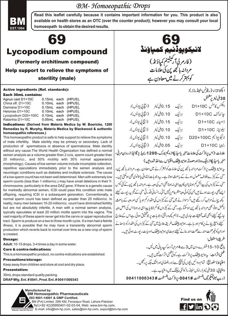 DRAP Product.Enl No. 00411000343 Composition: OrchitinumD20+100C, Testis BovisD20+100C, HeloniasD1+10C, Agnus CastD1+10C, DamianaD1+10C, China OffD1+10C,RatanhiaD1+10C Specific Indication: Male infertility because of abnormal semen analysis. Male sterility may be primary or secondary. Lack of production of spermatozoa or absence of spermatozoa. Male sterility without any cause. General Indication: The World Health Organization has defined a normal semen analysis as a volume greater than 2 cc?s, sperm count greater than 20 million/cc., and 50% motility with 30% normal appearance (morphology). Causes of low semen volume include incomplete collection, repetitive ejaculations immediately prior to the semen analysis, and neurologic conditions such as diabetes and multiple sclerosis. The cause of a low sperm count has not been well determined. Men with extremely low sperm counts (less than 1 million/cc.) may have small deletions in their Y-chromosome, particularly in the area DAZ gene. If there is a genetic cause for markedly abnormal semen, ICSI could pass this condition onto male offspring, requiring ICSI in a subsequent generation. Conventionally, a normal sperm count has been defined as greater than 20 million/cc. In reality, many men between 10-20 million/cc. count have diminished fertility but are not absolutely infertile. A man with a normal semen analysis, typically ejaculates at least 20 million motile sperm into the vagina. The vast majority of these sperm never get into the cervix or upper reproductive tract. It has been estimated that several hundred sperm advance to the fallopian tube where fertilization of the egg occurs. For that reason, low sperm motility is a more significant predictor of infertility compared even to low sperm count. The causes of low sperm motility are not well understood. Sperm is produce on a two to three month cycle. If a man had a febrile illness, it is possible that he may have a transiently abnormal sperm production which reverts back to normal over time as a new crop of sperm is created. In clinical trials it has been noticed that BM Sterility (Male) Compositum is of assistance and helpful to manage such cases, but it varies from case to case.
