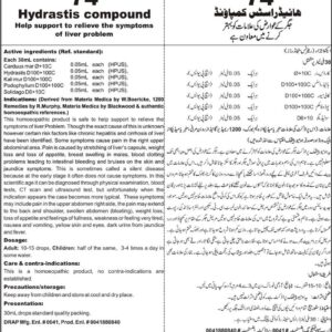 DRAP Product.Enl No. 0041880840 Composition: Carduus Mar?+10C, HydrastisD100+100C, Solidago?+10C, Kali MurD100+100C, PodophyllumD100+100C Specific Indication: Most cases of liver cancer are actually cancers that started in another organ. This is called metastases. Though the exact cause of liver cancer is unknown however certain risk factors like chronic hepatitis and cirrhosis of liver have been identified. Some symptoms cause pain in the right upper abdominal area. Pain is caused by stretching of liver?s capsule, weight loss and loss of appetite, breast swelling in males, blood clotting problems leading to intestinal bleeding and bruises on the skin and jaundice symptoms. General Indication: Liver cancer is sometimes called a silent disease because at the early stage it often does not cause symptoms. In this scientific age liver cancer can be diagnosed through physical examination, blood tests, CT scan and ultrasound test, but unfortunately when the malignant indication appears the case becomes more typical. The following symptoms are not sure signs of liver cancer but really play an important role while treating the patient. These symptoms may include pain in the upper abdomen right side, the pain may extend to the back and shoulder, swollen abdomen (bloating), weight loss, loss of appetite and feelings of fullness, weakness or feeling very tired, nausea and vomiting, yellow skin and eyes, dark urine from jaundice and fever.