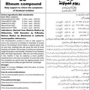 DRAP Product.Enl No. 0041880848 Composition: HelliborD10+100C, RheumD10+100C, Bryonia DiocaD10+100C, SeleniumD10+100C, Ambra GriseaD10+100C Specific Indication: Loosening of the facial skin and wrinkles on forehead causes lines on the forehead which makes us appear angry, sad, old and tired. Anything that will cause the skin to loose elasticity will hasten this process including sun exposure, weight fluctuations…
