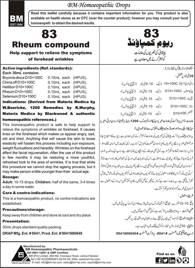 DRAP Product.Enl No. 0041880848 Composition: HelliborD10+100C, RheumD10+100C, Bryonia DiocaD10+100C, SeleniumD10+100C, Ambra GriseaD10+100C Specific Indication: Loosening of the facial skin and wrinkles on forehead causes lines on the forehead which makes us appear angry, sad, old and tired. Anything that will cause the skin to loose elasticity will hasten this process including sun exposure, weight fluctuations and heredity. General Indication: Wrinkles on the forehead affect the facial rejuvenation. Forehead lifts are possible by the use of BM Forehead wrinkles compositum to firm and tighten the skin. After the use of few months it is restoring a more youthful, refreshed look to the area of wrinkles. It is true that while this procedure we cannot stop the ageing process, but it makes person a little younger than their actual age.