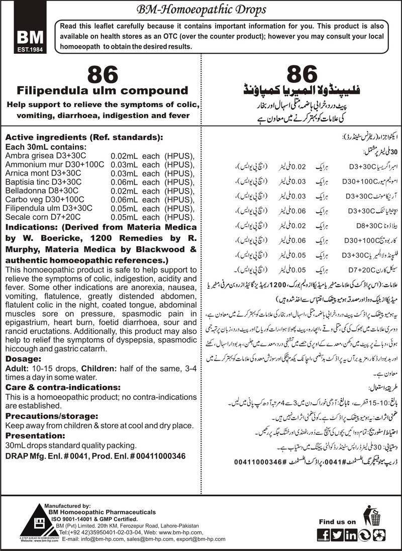 DRAP Product.Enl No. 00411000346 Help support to relieve the symptoms of colic, nausea, vomiting, diarrhoea, indigestion and fever. Active ingredients (Ref. standard): Ambra grisea D3+30C 0.02mL each (HPUS), Ammonium mur D30+100C 0.03mL each (HPUS), Arnica mont D3+30C 0.03mL each (HPUS), Baptisia tinc D3+30C 0.06mL each (HPUS), Belladonna D8+30C 0.02mL each (HPUS), Carbo veg D30+100C 0.06mL each (HPUS), Filipendula ulm D3+30C 0.05mL each (HPUS), Secale cor D7+20C 0.05mL each (HPUS)