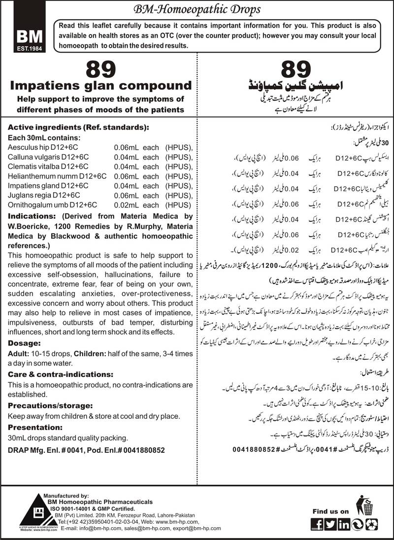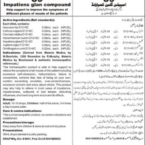 DRAP Product.Enl No. 0041880852 Help support to improve the symptoms of different phases of mood of the patients. Active ingredients (Ref. standard): Aesculus hipp D12+6C 0.06mL each (HPUS), Calluna vulgaris D12+6C 0.04mL each (HPUS), Clematis vitalba D12+6C 0.04mL each (HPUS), Helianthemum numm D12+6C 0.06mL each (HPUS), Impatiens glan D12+6C 0.04mL each (HPUS), Juglans regia D12+6C…