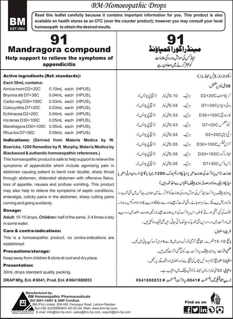 DRAP Product.Enl No. 0041880853 Help support to relieve the symptoms of appendicitis. Active ingredients (Ref. standard): Arnica mont D2+20C 0.10mL each (HPUS), Bryonia alb D7+30C 0.04mL each (HPUS), Carbo veg D30+100C 0.03mL each (HPUS), Colocynthis D7+20C 0.03mL each (HPUS), Echinacea D2+20C 0.04mL each (HPUS), Mandragora D30+100C 0.05mL each (HPUS), Iris tenax D30+100C 0.05mL each (HPUS), Rhus tox D7+30C 0.05mL each (HPUS).