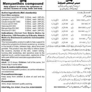 DRAP Product.Enl No. 0041880856 Help support to relieve the symptoms of chronic eczema of scalp, limbs and body. Active ingredients (Ref. standard): Ammonium carb D30+100C 0.03mL each (HPUS), Camphor D3+30C 0.06mL each (HPUS), Cicuta virosa D8+100C 0.06mL each (HPUS), Crocus sat D3+30C 0.03mL each (HPUS), Helonias D3+30C 0.03mL each (HPUS), Menyanthes D3+30C 0.02mL each (HPUS),…