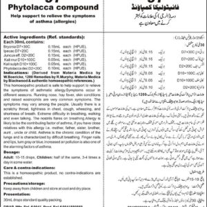 Composition: PhytolaccaD2 +20C, BryoniaD3+30C, IpecacD2+20C, Kali SulphD10+100C, Kali MurD10+100C, Blatta orienD2+20C, Juncus Eff.D2+20C Specific Indication: Allergy is the leading cause of asthma. Symptoms occur in different seasons. Symptoms of running nose, hay fever, skin conditions and raised eosinophils are very common symptoms of allergic asthma. Wheezing, coughing, shortness of breath and chest tightness are also…