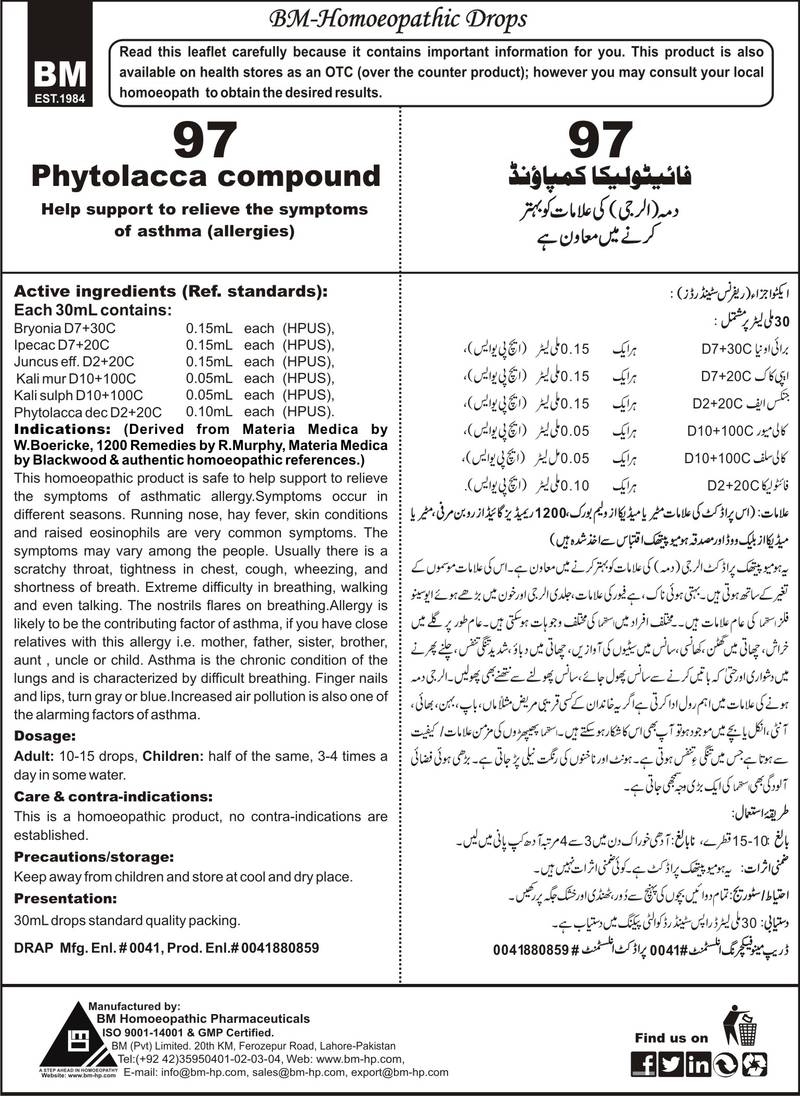 Composition: PhytolaccaD2 +20C, BryoniaD3+30C, IpecacD2+20C, Kali SulphD10+100C, Kali MurD10+100C, Blatta orienD2+20C, Juncus Eff.D2+20C Specific Indication: Allergy is the leading cause of asthma. Symptoms occur in different seasons. Symptoms of running nose, hay fever, skin conditions and raised eosinophils are very common symptoms of allergic asthma. Wheezing, coughing, shortness of breath and chest tightness are also the specific symptoms of allergic asthma. General Indication: The symptoms of asthma may vary among the people. Usually there is a scratchy throat, tightness in chest, cough, wheezing and shortness of breath. Extreme difficulty in breathing, walking and even talking. The nostrils flares on breathing. Allergy is likely to be the contributing factor of asthma, if you have close relatives with this allergy i.e. mother, father, sister, brother, aunt, uncle or child. Allergic patients develop the symptoms of running nose, hay fever, skin conditions and raised eosinophilia. Asthma is the chronic condition of the lungs and is characterized by difficult breathing. Finger nails or lips, turns gray or blue. Difficult to walk and talk and even extreme difficult breathing. Increased air pollution is also one of the alarming factors of bronchial asthma.