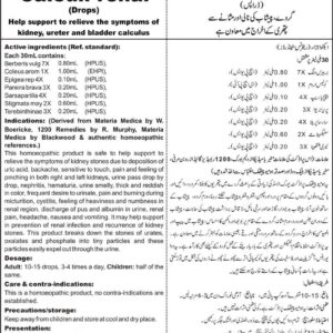 Help support to relieve the symptoms of kidney, ureter and bladder calculus Active ingredients (Ref. standards): Berberis vulg 7X 0.80ml (HPUS), Coleus arom 1X 1.00ml (EHPI), Epigaea rep 4X 0.10ml (HPUS), Pareira brava 3X 0.20ml (HPUS), Sarsaparila 4X 0.20ml (HPUS), Stigmata may 2X 0.60ml (HPUS), Terebinthinae 3X 0.20ml (HPUS).