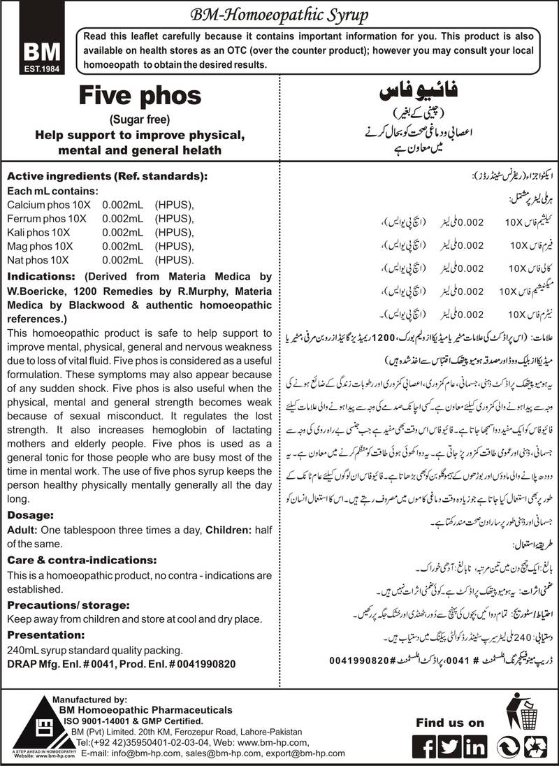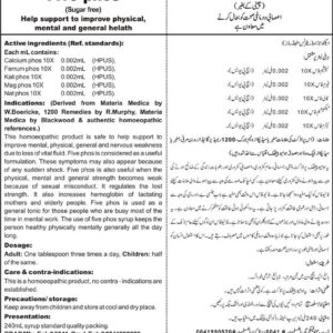 Help support to improve physical, mental and general helath Active ingredients (Ref. standard): Calcium phos 10X 0.002mL (HPUS), Ferrum phos 10X 0.002mL (HPUS), Kali phos 10X 0.002mL (HPUS), Mag phos 10X 0.002mL (HPUS), Nat phos 10X 0.002mL (HPUS)