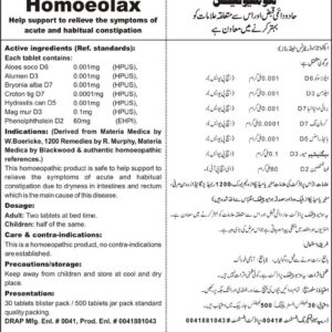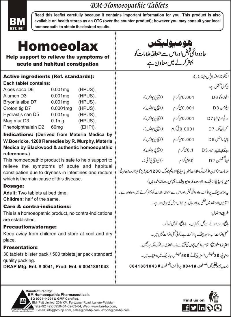 Help support to relieve the symptoms of acute and habitual constipation Active ingredients (Ref. standard): Aloes soco D6 0.001mg (HPUS), Alumen D3 0.001mg (HPUS), Bryonia alba D7 0.001mg (HPUS), Croton tig D7 0.0001mg (HPUS), Hydrastis can D5 0.001mg (HPUS), Mag mur D3 0.1mg (HPUS), Phenolphthalein D2 60mg (EHPI).