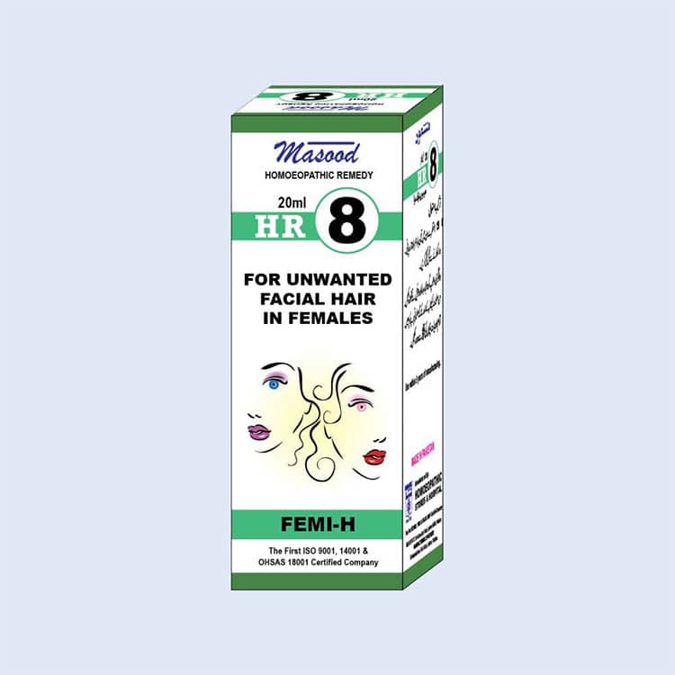 HR-8 contains Ignatia Amara and Thuja Occ in which active compounds Strychnine and brucine are psychoanaleptic produces arousing effects. Thuja produce anti-bacterial and antioxidant properties. HR 8 eradicates depressive states and promotes healthy hormonal balances.? HR 8 shows a marked hyperaesthenia of all the senses, and a tendency to clonic spasms. Mentally, the emotional element is uppermost, and co-ordination of function is interfered with facial and body hairs are considered secondary sex characteristics that form in response to androgens. Sensitivity to and overproduction of androgens in women can lead to hirsutism, or excess body and facial hair, in which excess androgen production is a symptom, Androgens also contribute to male- and female-pattern baldness, somehow preventing hair follicles from transitioning out of their normal resting phase. HR 8 works by slowing the metabolism of the hair follicle. It does not eliminate the hair but simply slows its growth. By slowing down how quickly it regrows, HR 8 can decrease how often hair needs to be removed and make a woman more confident. The cells surrounding the base of each hair (called the hair follicle) undergo rapid growth and maturation as they transform into hairs. Certain proteins called polyamines are needed for this rapid cell growth and differentiation, and the production of these polyamines depends on the activity of an enzyme, ornithine decarboxylase (ODC). HR 8may block ODC, slowing the growth and differentiation of the cells within the hair follicles.