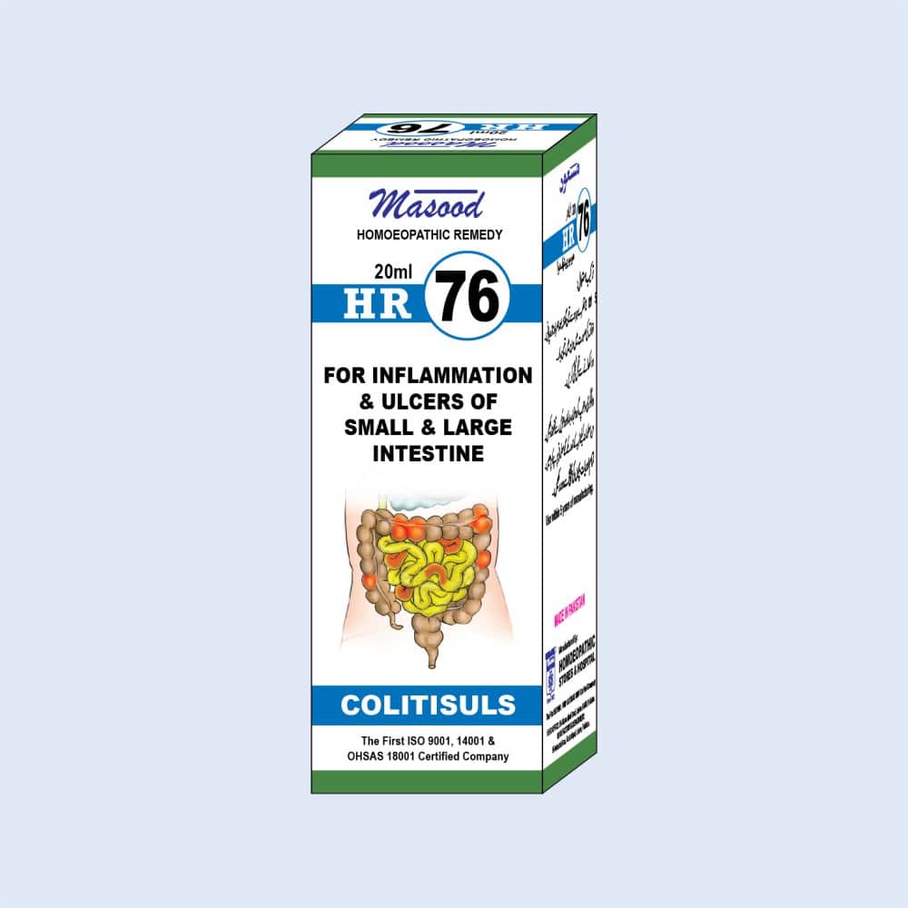 HR 76 is used for ulcers of small and large intestine. Indicated in inflammation of large or small intestine. Effective for abdominal cramps and fever. Used in bloody diarrhea due to infection. Reduces further weight loss and colic pain due to inflammation. Also helpful in nausea and sour eructation. Presentation: Bottle of 20 ml.