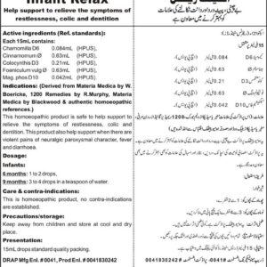 Help support to relieve the symptoms of restlessness, colic and dentition Active ingredients (Ref. standard): Chamomilla D6 0.084mL (HPUS), Cinnamonum 0.63mL (HPUS), Colocynthis D3 0.21mL (HPUS), Foeniculum vulg 0.63mL (HPUS), Mag. phos D10 0.042mL (HPUS).