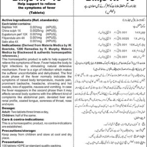 Help support to relieve the symptoms of fever Active ingredients (Ref. standards): Baptisia 14X 0.001mg (HPUS), China sulph 1X 0.0025mg (HPUS), Eupatorium perf 10X 0.001mg (HPUS), Filipendula ulm 4X 0.001mg (HPUS), Salix alba 4X 0.001mg (HPUS).