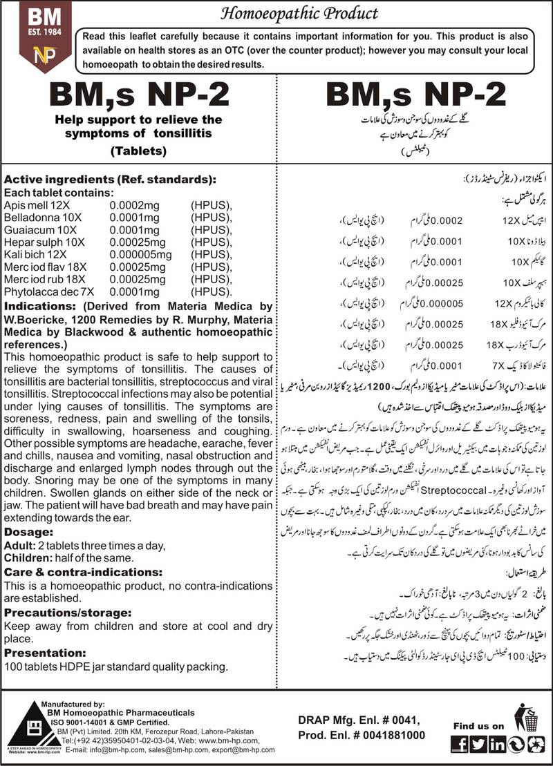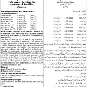 Help support to relieve the symptoms of tonsillitis Active ingredients (Ref. standards): Apis mell 12X 0.0002mg (HPUS), Belladonna 10X 0.0001mg (HPUS), Guaiacum 10X 0.0001mg (HPUS), Hepar sulph 10X 0.00025mg (HPUS), Kali bich 12X 0.000005mg (HPUS), Merc iod flav 18X 0.00025mg (HPUS), Merc iod rub 18X 0.00025mg (HPUS), Phytolacca dec 7X 0.0001mg (HPUS).