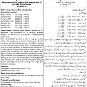 Help support to relieve the symptoms of growth disturbance Active ingredients (Ref. standards): Baryta carb 50C 0.0002mg (HPUS), Calc phos 50C 0.0002mg (HPUS), Ferr phos 50C 0.0002mg (HPUS), Ginkgo biloba 50C 0.0002mg (HPUS), Kali phos 50C 0.0002mg (HPUS), Mag phos 50C 0.0002mg (HPUS), Nat phos 50C 0.0002mg (HPUS).
