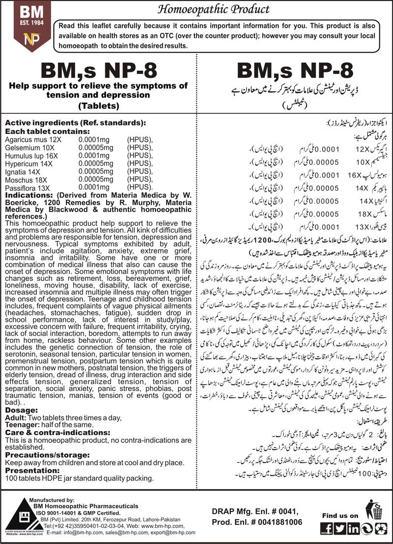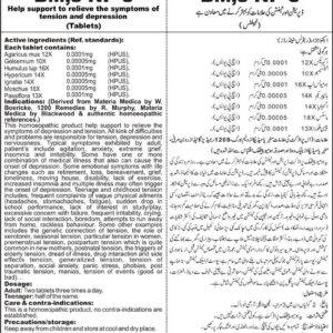 Help support to relieve the symptoms of tension and depression Active ingredients (Ref. standards): Agaricus mus 12X 0.0001mg (HPUS), Gelsemium 10X 0.00005mg (HPUS), Humulus lup 16X 0.0001mg (HPUS), Hypericum 14X 0.00005mg (HPUS), Ignatia 14X 0.00005mg (HPUS), Moschus 18X 0.00005mg (HPUS), Passiflora 13X 0.0001mg (HPUS).