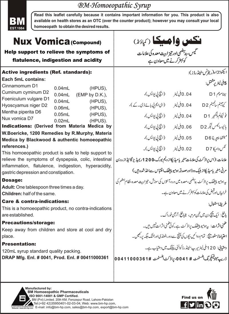 Composition: Cinnamon D1, Cuminum Cyminum D2, Hyoscyamus Niger D2, Illicium Anisatum D1, Mentha Piperita D6, Nux Vomica D3. General Indication: May help in the symptoms of dyspepsia, colic, intestinal inflammation, flatulence, indigestion, hyperacidity, gastric depression and constipation.